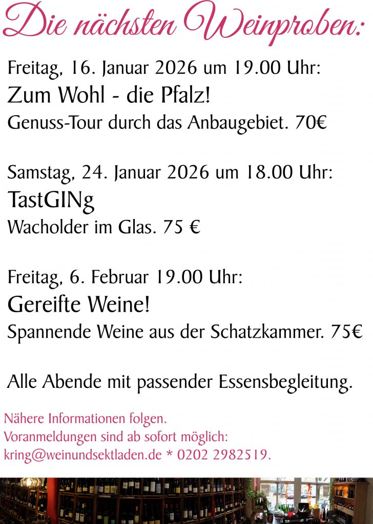 Teilnahmekosten 75,00 €. Ich bitte um verbindliche Voranmeldung bis zum 20.01.: kring@weinundsektladen.de * 0202 2982519.
